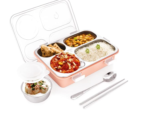 Attro Bento 4 Compartment Stainless Steel Lunch Box with 1 Small Bowl Inside, Steel Spoon & Chopstick, 900 Ml